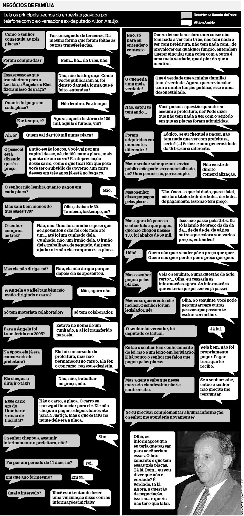 Os R$ 180 mil cobrados por uma placa de táxi no mercado clandestino em Curitiba deixaram incrédulo o ex-vereador e ex-deputado Ailton Cardozo de Araújo, mas não devido a um inesperado surto de zelo pela administração pública ao ver o escândalo da máfia laranja estampado na Gazeta do Povo de domingo passado. Araújo, que por 11 dias foi prefeito da capital, em 1999, não acredita nesse valor porque ele próprio pagou "abaixo de 60" nas placas mantidas em nome da mulher, Lucilda Wasilewski de Araújo, e dos filhos Ângela e Eliel Wasilewski de Araújo. O ex-parlamentar, cuja obrigação era coibir abusos na administração pública, foi mais um a se beneficiar do comércio ilegal de serviço público.