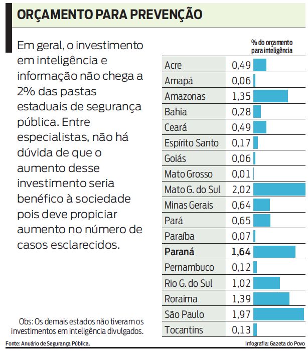 Os serviços de inteligência e de levantamento de informações da polícia dificilmente aparecem nos holofotes. E, talvez, nem seja a intenção das secretarias de Segurança Pública que estejam. Além de fora do foco, essas duas áreas fundamentais para a prevenção e esclarecimento de casos estão à margem dos orçamentos estaduais, de acordo com o Anuário do Fórum de Segurança Pública. O estado com maiores investimentos em 2009 Mato Grosso do Sul dispõe de apenas 2% para o setor; São Paulo alcança 1,97%; e o Paraná ocupa o terceiro posto, com R$ 20 milhões de um orçamento de R$ 1,2 bilhão, contabilizando 1,64%. Outros estados, como Mato Grosso e Amapá, não chegam a destinar 0,1% à área.