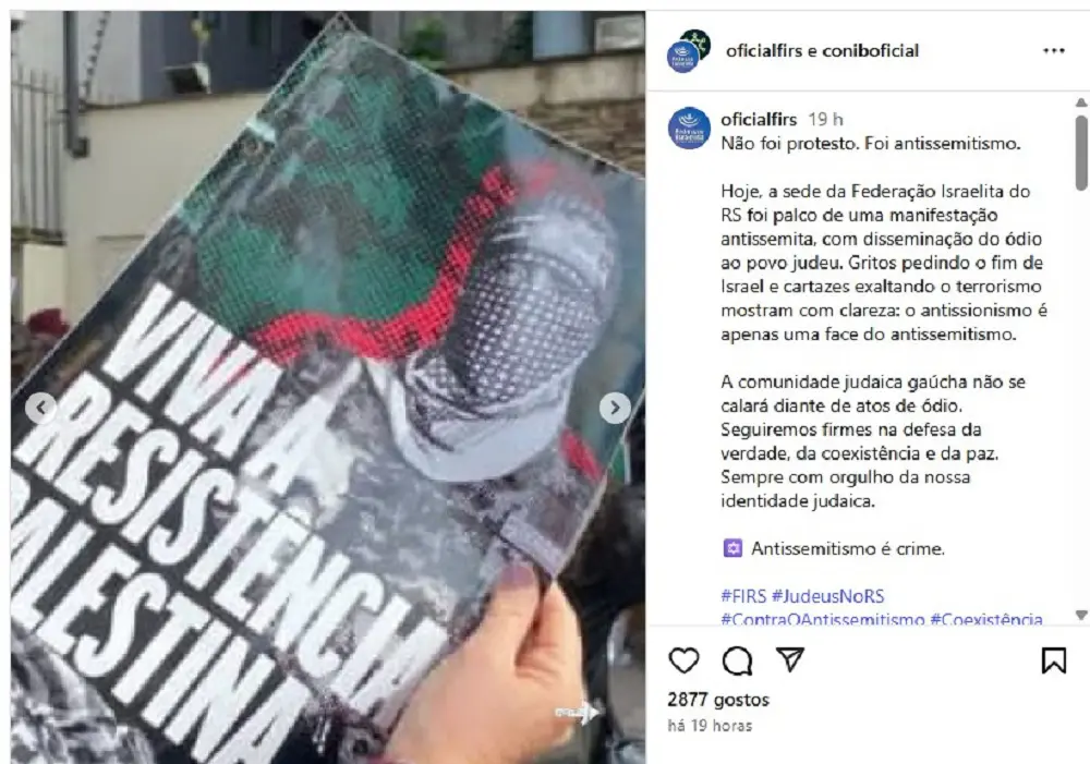 A Federação Israelita do Rio Grande do Sul (FIRS) — entidade representativa da comunidade judaica gaúcha — foi às redes sociais nesta terça-feira (9) para denunciar uma manifestação antissemita realizada em frente à sede da instituição. O protesto foi registrado na segunda-feira (9), em Porto Alegre, por manifestantes com cartazes e faixas favoráveis à Palestina.
