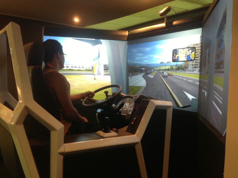 Em um primeiro momento, as telas com imagens em 3D, o volante robusto e a poltrona que balança a cada curva podem lembrar um fliperama de corrida. Mas, neste caso, mesmo para pisar no acelerador e desviar dos carros de mentira é preciso ter carteira de motorista. E uma dose de habilidade extra. Afinal, não se trata de uma Ferrari em miniatura, e sim de um ônibus articulado.