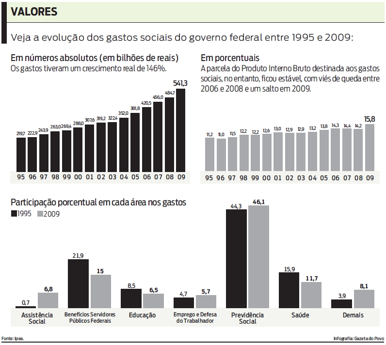 Os valores totais passaram de R$ 219,7 bilhões, em 1995, para R$ 541,3 bilhões, em 2009 um aumento de 146%. O estudo descontou o efeito da inflação acumulada no período. Os dados mostram ainda que, em 1995, os gastos sociais federais representavam 11,24% do Produto Interno Bruto (PIB) brasileiro. Em 2009, o porcentual chegou a 15,8%, o maior patamar verificado nos 15 anos analisados.