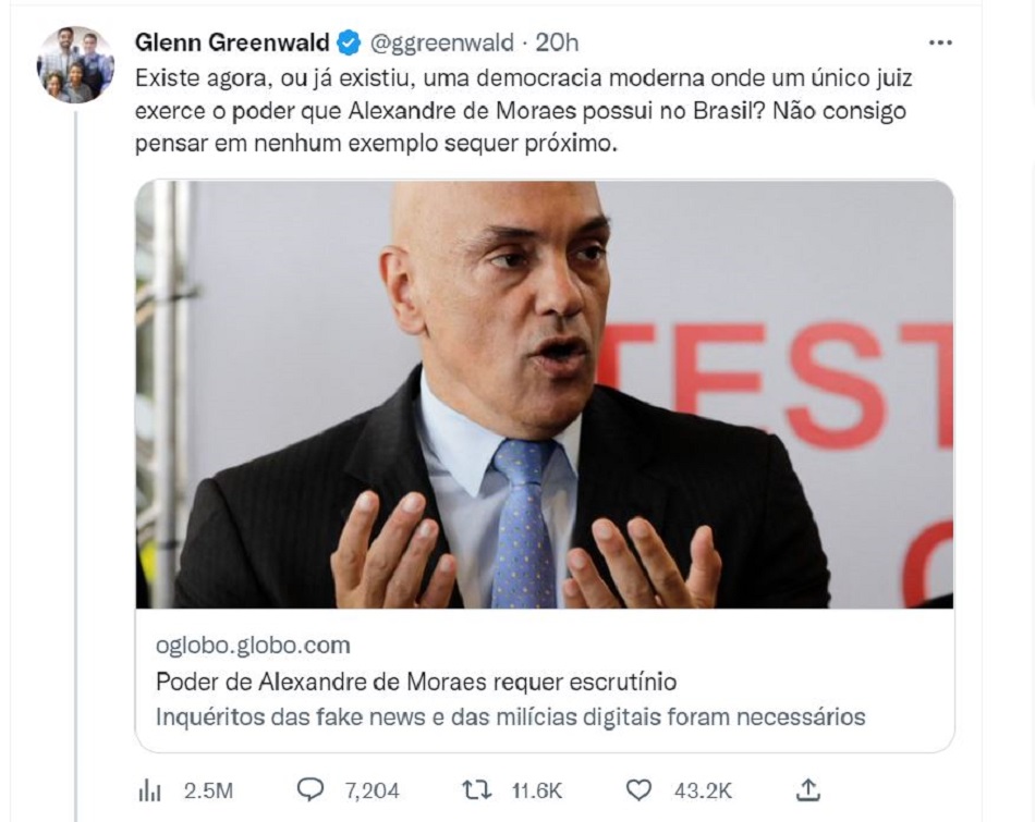 Em outra postagem, o jornalista escreveu: “Uma das maiores ironias da extraordinária popularidade de Moraes entre a mídia corporativa e a esquerda foi que ele serviu como Ministro da Justiça, e depois foi indicado para o STF, por um presidente e governo amplamente considerado na época não só ilegítimo, mas ‘golpista’”.