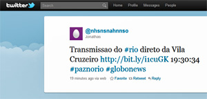 As mensagens estavam sendo enviadas repetidamente por volta das 19h30 desta sexta-feira (26) e usavam o site malicioso "0gl0bo". As hashtags #Rio, #globonews e #paznorio também estavam no tweet, demonstrando a intenção de atacar os internautas que acompanhavam essas tags.