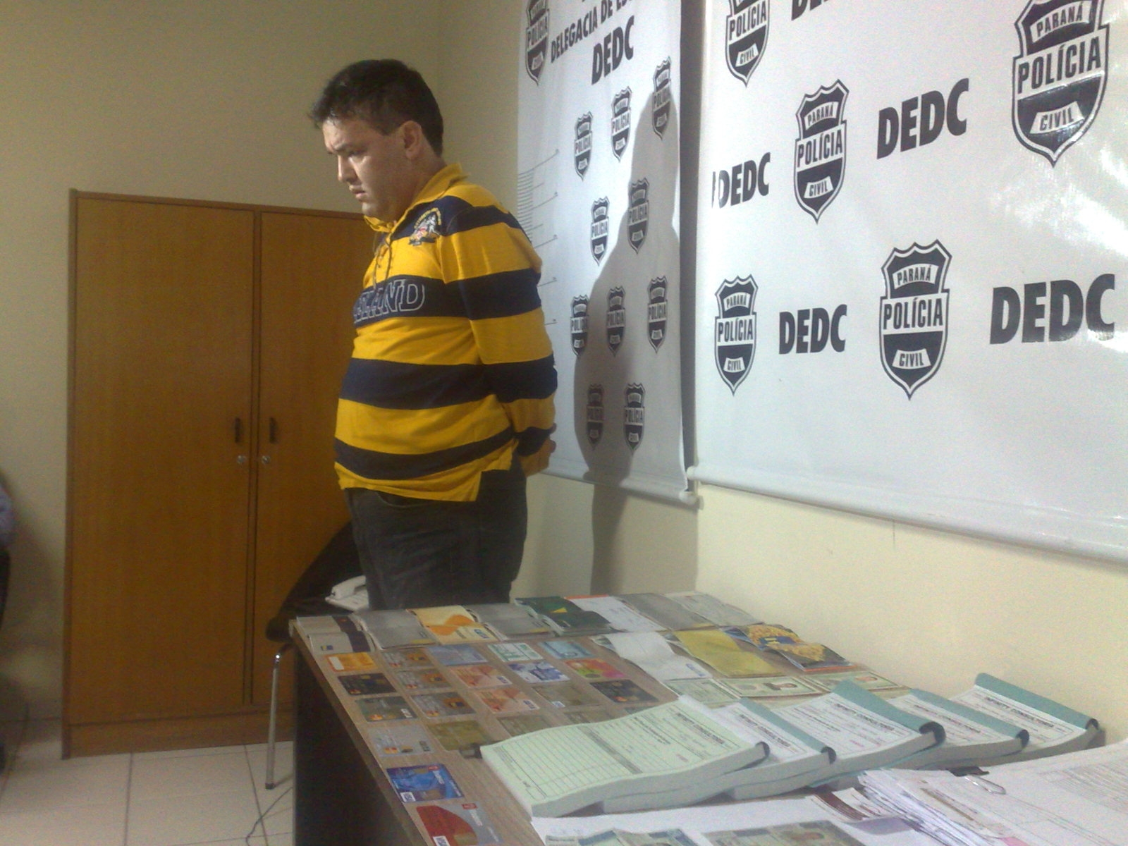 Na casa dele, os policiais encontraram documentos que abarrotaram três mesas da delegacia. Dentre o material, estão 19 cartões bancários e dez talões de cheques, além de documentos pessoais (como RGs e títulos de eleitor). A polícia também apreendeu um automóvel Mercedes Benz e uma caminhonete Pajero, que o acusado também teria comprado a partir de golpes aplicados em Curitiba e região metropolitana.
