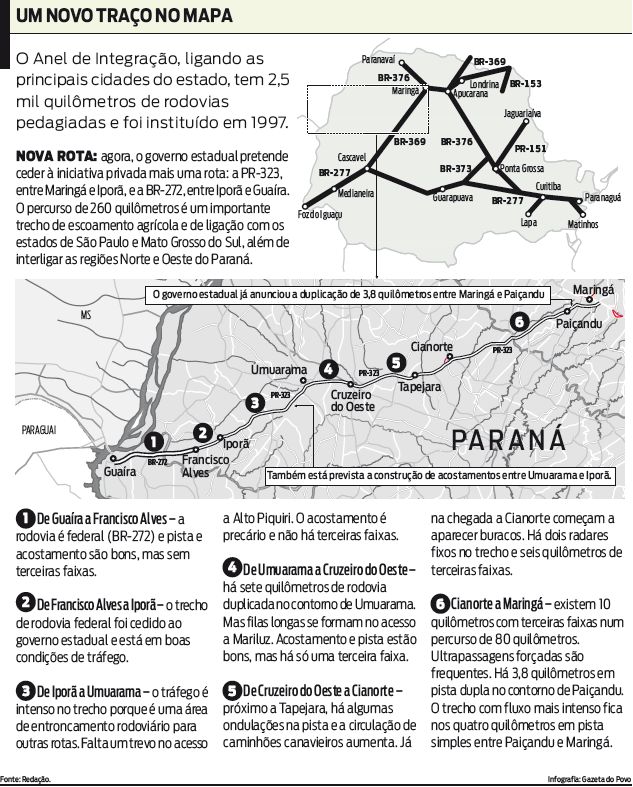 Após nove anos sem entregar rodovias para a iniciativa privada (a última foi em 2002, entre Lapa e Araucária), o governo do Paraná decidiu retomar o programa de concessão de estradas. Os trechos da PR-323 e da BR-272, entre Maringá e Guaíra, passarão para uma concessionária no ano que vem. A Secretaria de Estado de Infraestrutura e Logística ainda estuda a forma do contrato: pode ser uma concessão igual às já existentes, um pedágio apenas de conservação da rodovia ou uma Parceria Público-Privada (PPP). Tampouco há decisão sobre localização e quantidade de praças de pedágio. Definido mesmo só que o governo investirá em obras na rodovia antes de colocá-la em licitação.