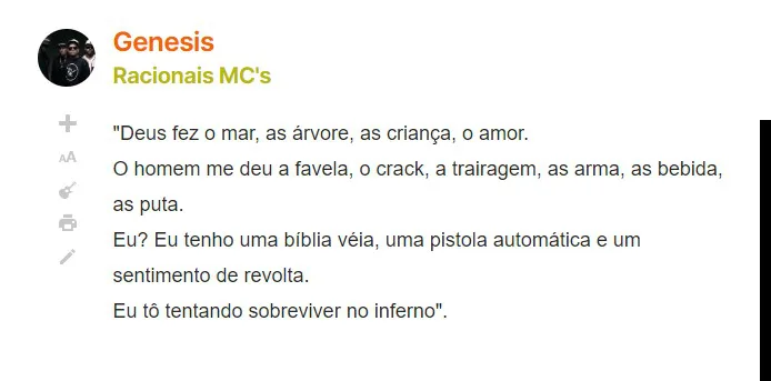 “Os Racionais MC’s extrapolam a fala do gueto, sem abandoná-lo. Não se restringem à crônica cotidiana, mas a revelam”, pontuam os docentes no documento de proposição, ao citar a Universidade mudou. “Já não mais exclusiva, mas inclusiva. Já não mais branca, mas com todas as cores do próprio Brasil e do mundo. Uma Universidade sobretudo mais generosa e justa”.