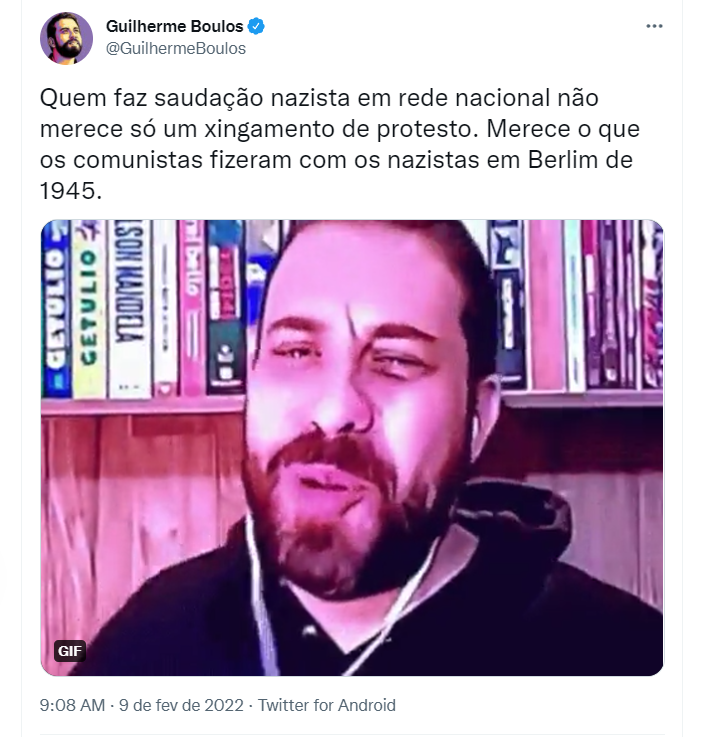 “Quem faz saudação nazista em rede nacional não merece só um xingamento de protesto. Merece o que os comunistas fizeram com os nazistas em Berlim de 1945”, disse Boulos. A postagem foi apagada poucas horas depois da publicação.