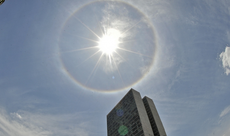 O fenômeno óptico halo no céu da capital federal chamou atenção da população nesta sexta-feira. Um anel colorido se formou ao redor do sol. Segundo o professor de física da Universidade de Brasília (UnB) José Leonardo Ferreira, o fenômeno não é inusitado, depende das condições atmosféricas favoráveis.