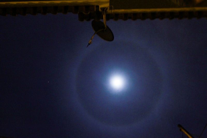 Quem prestou atenção no céu nesta terça-feira (13) em Curitiba ganhou de presente a vista de um fenômeno natural. A foto acima foi tirada pelo fotógrafo Daniel Castellano por volta das 23h. De acordo com o meteorologista Fernando Mendes, do Instituto Tecnológico Simepar, trata-se de um halo lunar. "São cristais de gelo na alta troposfera que provocam uma refração da luz. Isso acaba gerando um halo em forma de círculo", explica.
