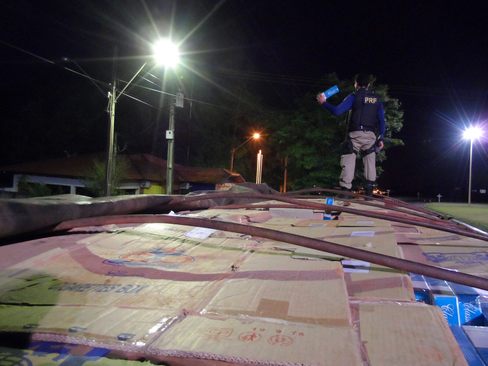 Pressionado para mostrar a nota fiscal, o homem cedeu, e confessou carregar caixas de cigarros ilegais, nos dois semirreboques do caminhão, do tipo bitrem.