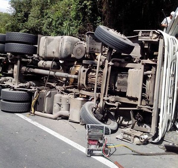 Um caminhão carregado de cimento, com placas de Chapecó (SC), saiu da pista sentido Curitiba-Lapa e tombou na via contrária, espalhando a carga sobre a rodovia. O motorista morreu e o ajudante ficou ferido. A Polícia Rodoviária Federal (PRF) ainda não sabe determinar as causas do acidente.