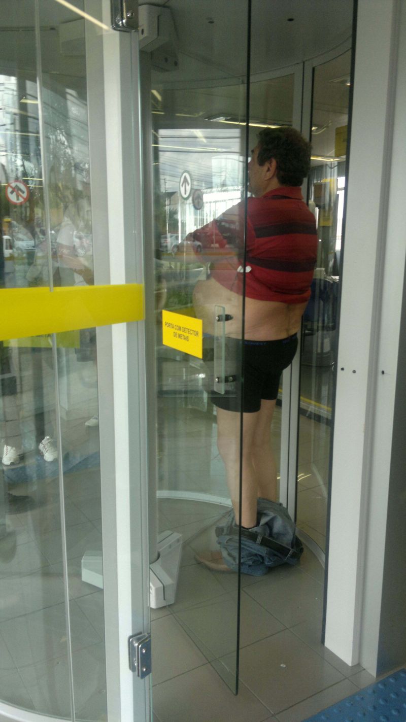 Um homem se irritou ontem ao entrar em uma agência bancária no bairro Uberaba, em Curitiba, e baixou as calças para provar que estava desarmado. O cliente ficou indignado diante dos questionamentos da segurança do banco, que perguntava se ele portava objetos de metal. Cansado de ter sua entrada impedida, não teve dúvidas: arriou a calça até o tornozelo, aguardando providências. O flagrante foi feito pelo repórter Oswaldo Eustáquio.