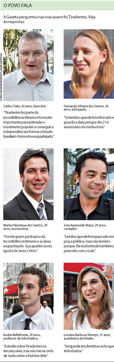 Milhares de brasileiros que irão desfrutar amanhã do feriado de 21 de Abril, celebrado em todo o país, não lembram quem foi Tiradentes e o que o personagem histórico homenageado nesta data representou para o Brasil. A história de Joaquim José da Silva Xavier, o Tiradentes, é contada no ensino fundamental, como parte importante da formação do Estado nacional. Mas a memória muitas vezes não ajuda a lembrar os fatos.