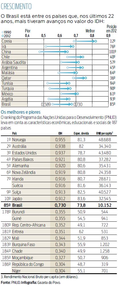 Por outro lado, quando observado o cenário a longo prazo, o Brasil é um dos países cujo IDH mais cresce no mundo. Entre 1990 e 2012, esse crescimento chegou a 23,7%, o melhor desempenho entre os grandes países da América do Sul. Dentre os Brics, no entanto, é bem inferior à evolução de China (41,2%) e Índia (35,1%) diferença explicada em grande medida pelos baixos patamares dos quais esses outros países saíram.
