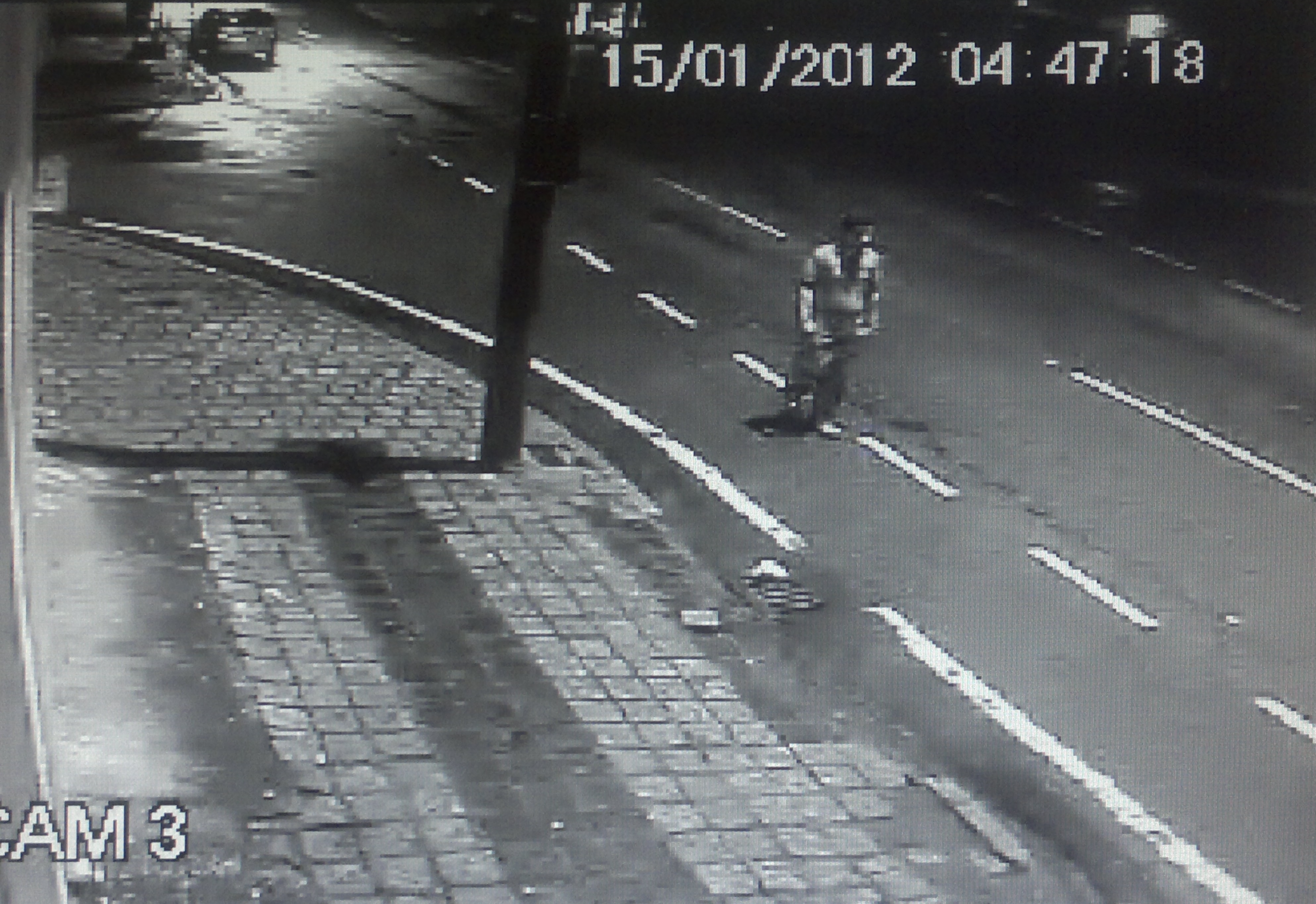 O primeiro suspeito aparece nas filmagens às 5h47*, caminhando na Rua Alferes Poli. Ele atravessa a via, caminhando em direção ao local onde o carro de Wosniak estava estacionado. O homem aparentemente jovem e que usa camisa listrada olha diversas vezes para o lado, enquanto cruza a rua.