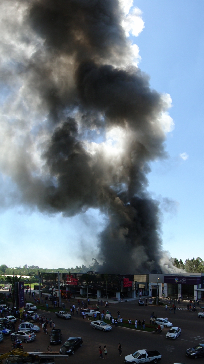 Um incêndio de grandes proporções atingiu um shopping atacadista de Cianorte, na tarde de ontem, e deixou metade do prédio completamente destruída. O fogo começou por volta de 14h30 e só foi controlado perto das 17 horas. No momento em que o incêndio começou, cerca de 250 pessoas estavam no local. Ninguém ficou ferido. O Instituto de Criminalística fará uma perícia no local hoje, mas já se sabe que o fogo começou na loja Denúncia Jeans, de propriedade do mesmo grupo comercial que é dono do shopping. O Open Shopping Cianorte abriga 60 lojas de atacado de confecções e acessórios e foi inaugurado em 18 de outubro. O fogo pode ter começado no sistema de ar-condicionado.