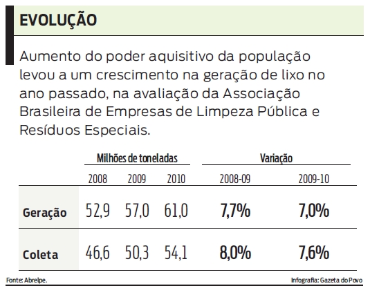 O índice de geração de lixo no Brasil cresceu 7% de 2009 para 2010, de acordo com estudo da Associação Brasileira de Empresas de Limpeza Pública e Resíduos Especiais (Abrelpe). Em 2009, o país gerou 57 milhões de toneladas, saltando para 61 milhões no ano seguinte. Isolado, o crescimento já preocupa, mas outro dado agrava a situação: no mesmo período, a população aumentou em apenas 1%. Com a provável ampliação do poder aquisitivo, a tendência é de que a geração de resíduos continue a subir ano após ano, causando danos ao meio ambiente, já que 37% dos resíduos vão para lixões. Segundo o Panorama dos Resíduos Sólidos, cada brasileiro produz 378 quilos de lixo por ano. E a dificuldade é diminuir o índice enquanto a população consome mais. "É um desafio que estamos correndo atrás há algum tempo, mas não desenvolvemos a ideia do consumo responsável", opina o professor de Engenharia Civil, Ambiental e do mestrado em Gestão Urbana da PUCPR Carlos Mello Garcias. "Como os novos consumidores querem fazer o mesmo que sempre viram acontecer, o problema deve se agravar."