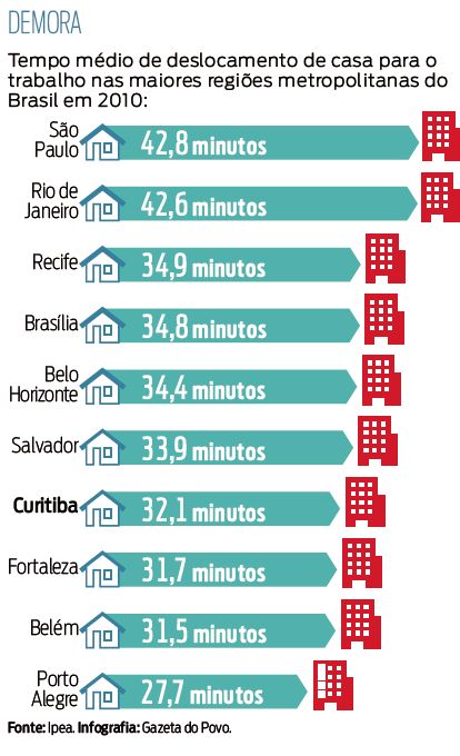 O tempo médio que os moradores das principais capitais brasileiras demoram no trajeto casa-trabalho é relativamente maior, na comparação com regiões metropolitanas com mais de 2 milhões de habitantes de outros países. Em São Paulo e no Rio de Janeiro o cidadão gasta 31% a mais de tempo no percurso. Os dados constam de estudo do Instituto de Pesquisa Econômica Aplicada (Ipea), que analisou dados da Pesquisa Nacional por Amostra de Domicílios (Pnad), do Instituto Brasileiro de Geografia e Estatística (IBGE), no período entre 1992 e 2009. As informações são da Agência Brasil.