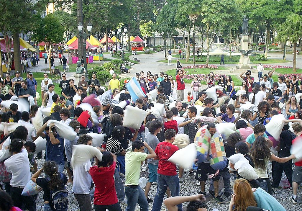 Dezenas de jovens se reuniram na tarde deste sábado (4) para uma guerra de travesseiros na Praça Santos Andrade, em frente ao prédio histórico da Universidade Federal do Paraná, no centro de Curitiba. A brincadeira em comemoração ao Dia Mundial da Guerra de Travesseiros (Pillow Fight) foi organizada pelo Curitiblogs, um grupo de blogueiros da cidade. Ainda não foi divulgado o total de público participante.