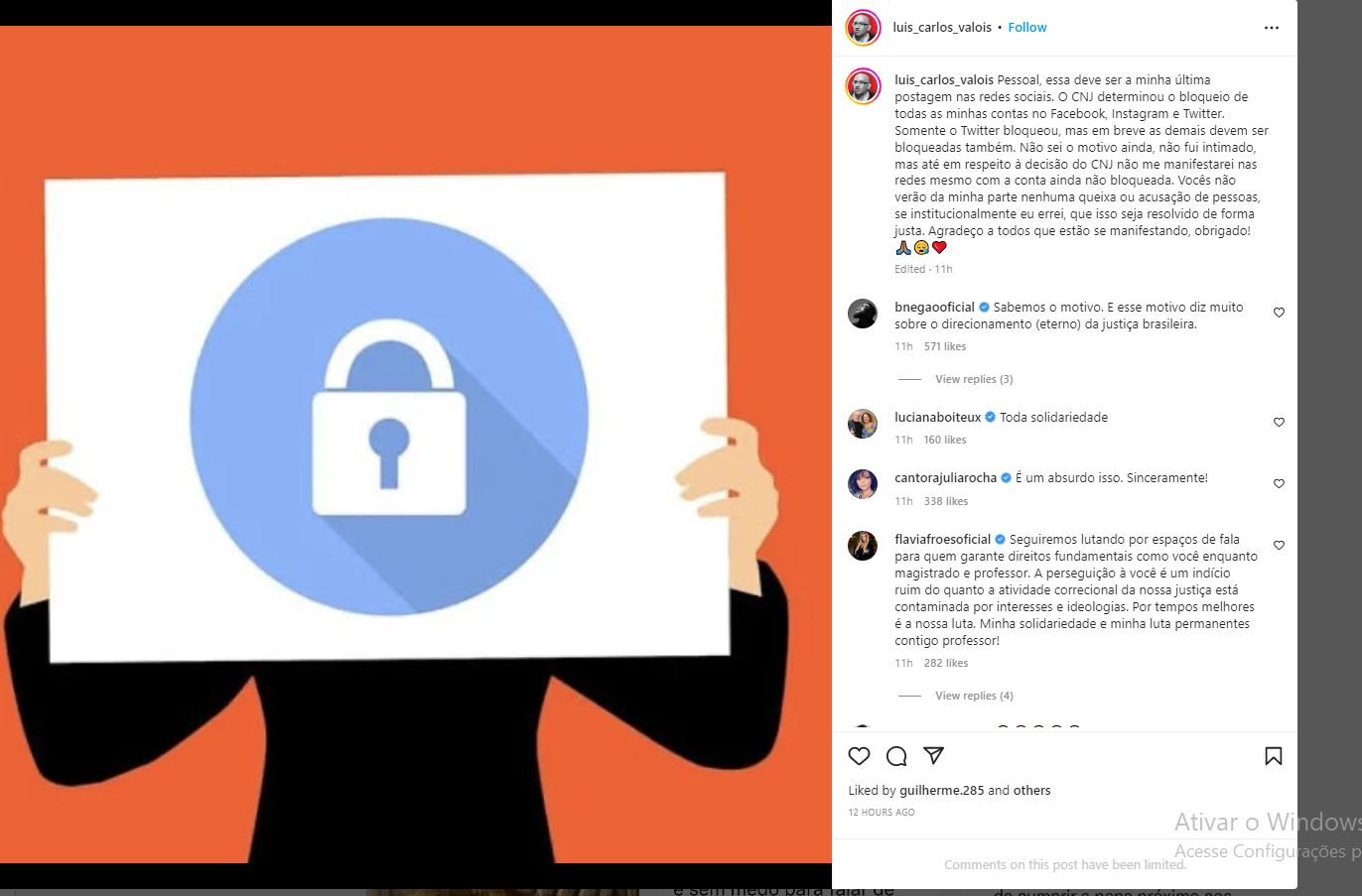 “Não sei o motivo ainda, não fui intimado, mas até em respeito à decisão do CNJ não me manifestarei nas redes mesmo com a conta ainda não bloqueada. Vocês não verão da minha parte nenhuma queixa ou acusação de pessoas, se institucionalmente eu errei, que isso seja resolvido de forma justa”, disse Valois pelo Instagram, antes de ser suspenso.