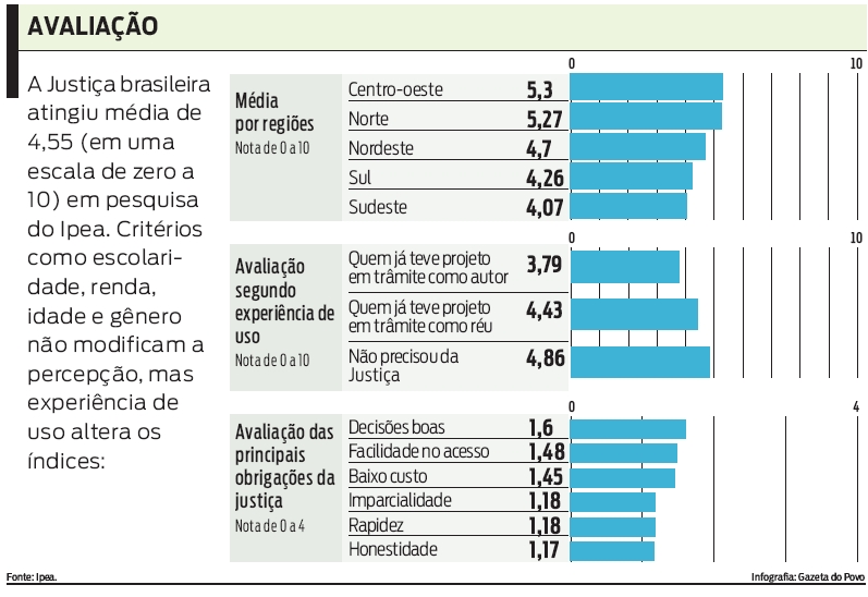 Em uma escala de zero a 10, a Justiça brasileira recebeu nota média de 4,55 da população, mostra pesquisa realizada pelo Instituto de Pesquisa Econômica Aplicada (Ipea) divulgada ontem. Considerando a avaliação como "crítica", o estudo indica a demora para resolver casos aliada à falta de imparcialidade e de honestidade dos integrantes do sistema judiciário como principais falhas. Não é a primeira vez que a justiça fica "abaixo da média": no ano passado, o sistema judiciário alcançou 5,6 pontos (em escala de 0 a 10) no Índice de Confiança na Justiça (ICJ Brasil), calculado pela Fundação Getulio Vargas (FGV) em razão da falta de qualidade e dificuldade de acesso.No recorte por regiões, a Centro-oeste atribuiu a maior nota à Justiça (5,30) e a Sudeste, a pior (4,07). A pesquisa não explica os motivos para tal divergência. Nos números, o estudo não apresenta diferenças consideráveis na análise levando em conta aspectos específicos, como renda, escolaridade, sexo, idade e raça/etnia. Os brasileiros de renda menor, porém, deram notas maiores à Justiça: 4,61 para classe E (renda de até dois salários mínimos); 4,62 para classe D (entre dois e cinco salários); enquanto a classe B (entre 10 e 20) atribuiu nota 4,5; e a classe A (mais de 20) deu a nota 4,43.