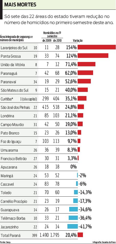 As áreas de Ponta Grossa, nos Campos Gerais, e Laranjeiras do Sul, no Centro-Sul do estado, foram as que registraram o maior crescimento. Nessas regiões, a quantidade de homicídios mais do que dobrou quando se compara o primeiro semestre de 2010 ao mesmo período do ano passado. A área de Laranjeiras do Sul engloba dez municípios e teve o maior aumento do estado, de 154%. Foram 28 homicídios no primeiro semestre de 2010, contra 11 no primeiro semestre de 2009. O número já supera o registrado em todo o ano passado, quando foram registrados 20 casos.