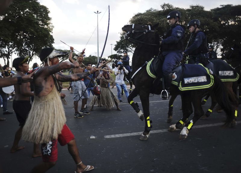 Em seguida, com o reforço dos povos indígenas, que ocuparam ontem a marquise do Congresso, o grupo seguiu pelo Eixo Monumental rumo ao Estádio Nacional de Brasília, onde a taça da Copa estava sendo exibida. Nas proximidades da Torre de TV, a cerca de 700 metros da arena, policiais e manifestantes iniciaram o confronto.