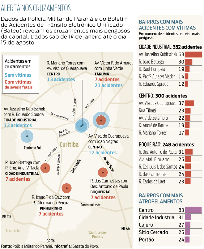 Todo cuidado é pouco na hora de trafegar pelo cruzamento entre a Avenida Victor Ferreira do Amaral e a Linha Verde, no bairro Tarumã, em Curitiba. O ponto lidera o ranking de cruzamentos com o maior número de acidentes registrados na capital de 1.º de janeiro até o dia 15 de agosto, segundo dados da Polícia Militar do Paraná (PM-PR) e do Boletim de Acidentes de Trânsito Eletrônico Unificado (Bateu). No período foram 28 acidentes no local, e desses, sete terminaram com pessoas feridas.