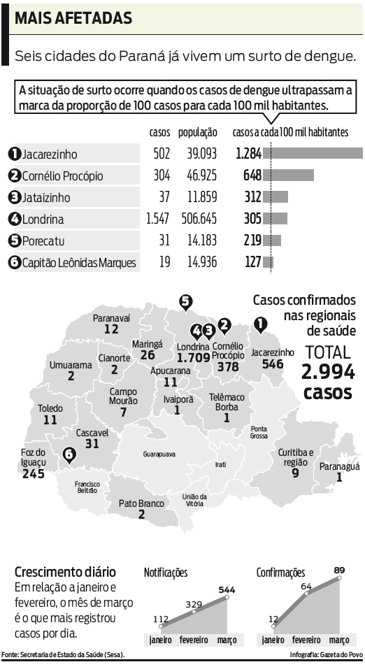 De acordo com o superintendente em Vigilância em Saúde da Sesa, Sezifredo Paz, os números de março foram influenciados pelos casos das regionais de saúde de Jacarezinho e Londrina, que apresentam o maior número de notificações 1,8 mil e 5,6 mil casos, respectivamente. "Essas duas cidades, que estão em estado mais crítico, puxaram os números para cima", analisa.