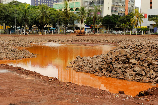A chuva dos últimos dias atrasou a construção do estacionamento no terreno da antiga Estação Rodoviária Américo Dias Ferraz, a Rodoviária Velha, em Maringá.