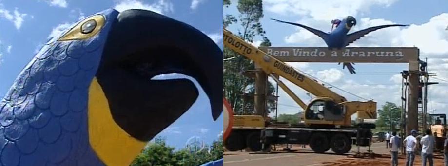 Arara de cor azul e amarelo simboliza o nome do município e foi instalado na PR-468, na saída de Araruna para Campo Mourão