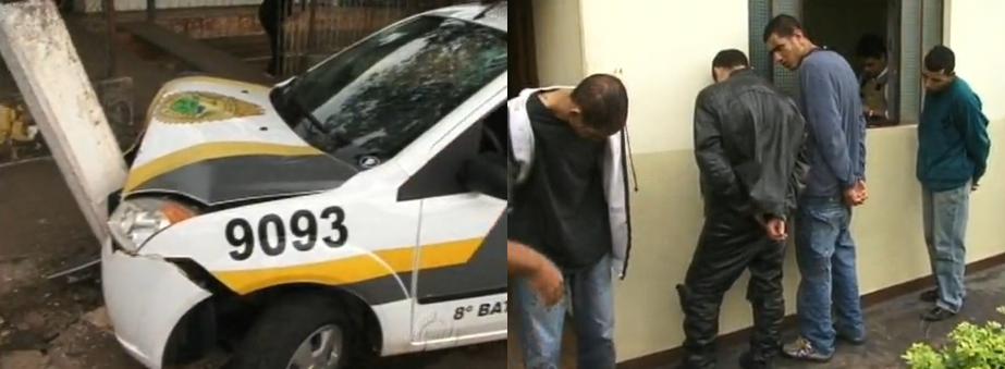 Policiais perseguiram os ladrões, que acabaram batendo a viatura em um poste e sendo presos na sequência. As informações são da PM. Houve tiroteio durante a perseguição. Um dos ladrões ficou ferido com o acidente.