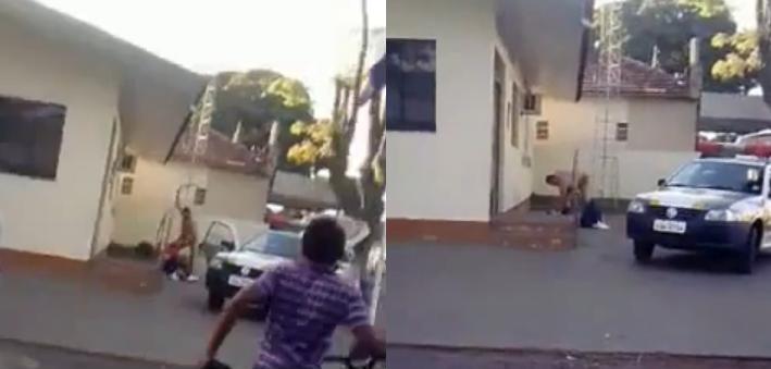 Um policial militar foi flagrado agredindo um morador em frente à delegacia de Lobato, no Noroeste do Paraná, no último sábado (14). A cena do policial, batendo no morador, que não reagia, com um cacetete, foi filmada por moradores e divulgada pela RPCTV nesta quarta-feira (18).