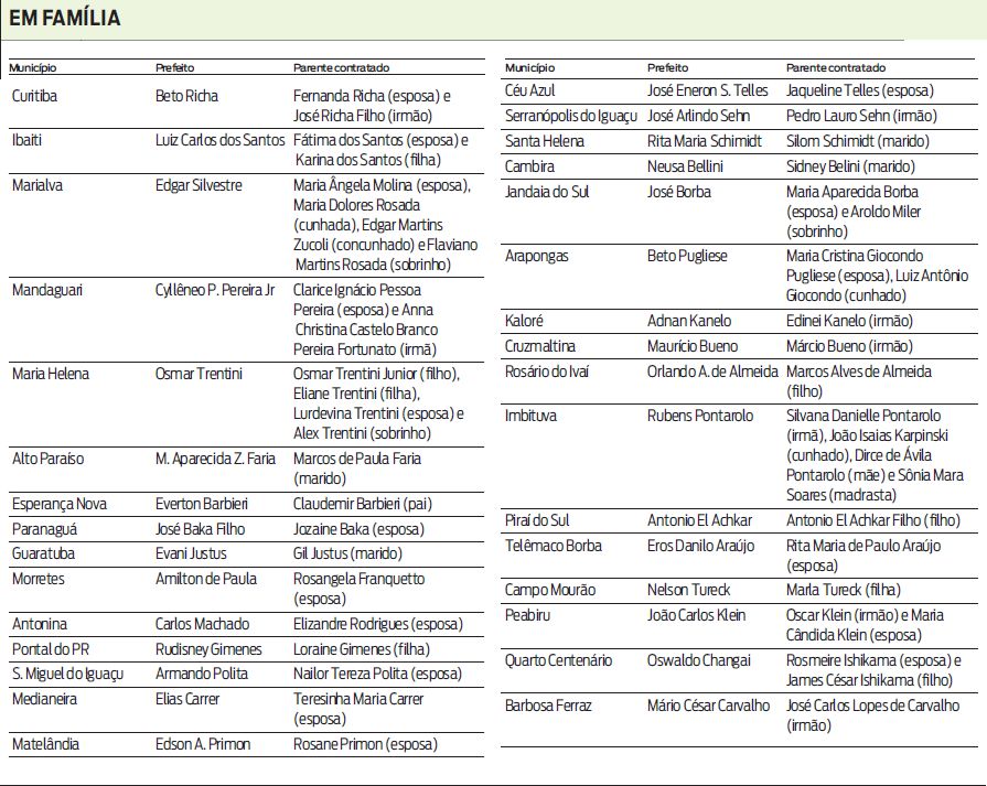 Boa parte dos novos prefeitos paranaenses iniciou os trabalhos nomeando as pessoas que vão compor os cargos do primeiro escalão nas prefeituras. Os prefeitos de pelo menos 31 municípios do estado nomearam parentes para as secretarias municipais. Na região de Maringá, Noroeste do estado, o prefeito de Marialva, Edgar Silvestre, contratou três familiares para assumir cargos de secretários e outro parente para ficar à frente de uma diretoria. Em Mandaguari, o prefeito reeleito Cyllêneo Pessoas Pereira Júnior, manteve a esposa e a irmã nas secretarias.