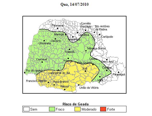No estado, há previsão para formação de geadas, principalmente para a metade sul paranaense. Para os setores mais ao norte, com a incursão do ar frio, há possibilidade de geadas localizadas em áreas de baixada de pontos mais ao norte.