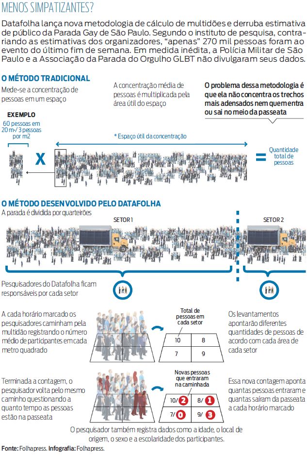Para chegar aos 270 mil participantes, 35 pesquisadores do Datafolha percorreram toda a extensão da Avenida Paulista e da Rua da Consolação, vias onde a Parada Gay é realizada. No percurso, eles contaram quantas pessoas havia por metro quadrado. Em seguida, voltaram perguntando aos participantes há quanto tempo eles estavam no evento.