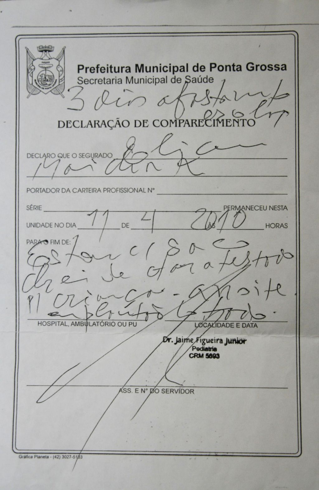 Ponta Grossa - Era para ser um atestado como outro qualquer, mas o médico Jaime Figueira Júnior resolveu usá-lo como um canal para demonstrar sua frustração profissional. "Estou de saco cheio de dar atestado para criança em dia de plantão lotado", escreveu ele no documento em que deveria anotar a recomendação de três dias de afastamento escolar para uma criança.
