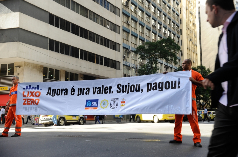 A prefeitura do Rio de Janeiro pôs em prática ontem o programa Lixo Zero, que vai punir pedestres que jogarem lixo na rua. Em dez horas de fiscalização no centro da cidade, 110 pessoas foram multadas, segundo balanço divulgado às 17 horas pela Companhia Municipal de Limpeza Urbana (Comlurb). A maior parte dos infratores, 66%, terá de pagar multa de R$ 157 por ter descartado bituca de cigarro no chão. Não houve registros de resistência à aplicação da multa, da qual é possível recorrer.