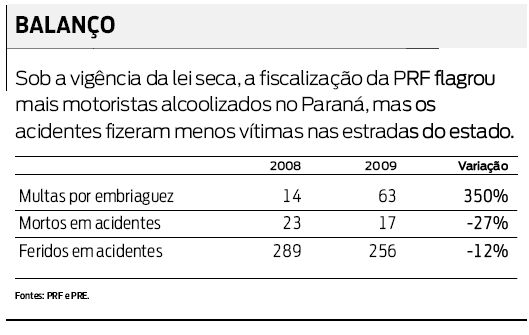 O número de motoristas multados por dirigir sob efeito de álcool cresceu 350% nas rodovias federais do Paraná na comparação do feriado de Páscoa de 2009 com o mesmo período do ano passado. Em 2008, 14 pessoas foram multadas pela infração; neste ano, foram 63 os condutores enquadrados. O número de mortos e feridos nos acidentes, por sua vez, diminuiu, não só nos 1,1 mil quilômetros sob a responsabilidade da Polícia Rodoviária Federal (PRF), mas também nos 15 mil km fiscalizados pela Polícia Rodoviária Estadual (PRE).