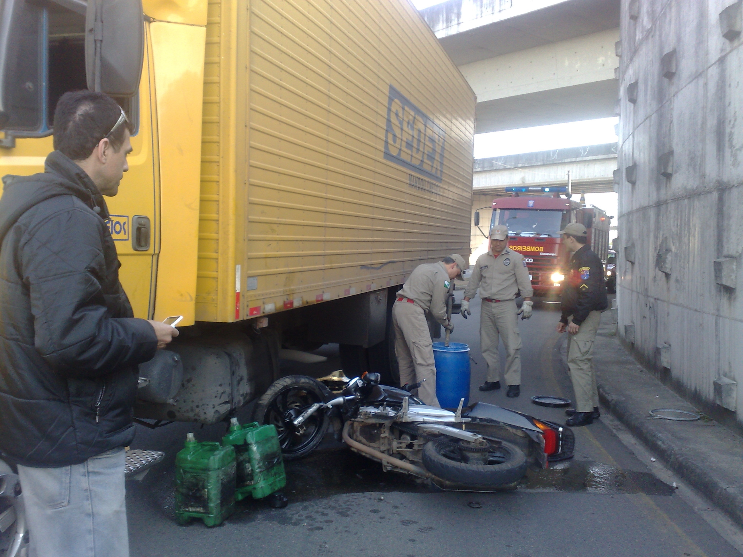 Por volta das 16h30, uma equipe do Corpo de Bombeiros espalhava cal pela via para evitar que o combustível se inflamasse. Perto deste horário, o trânsito fluía em meia pista na região do acidente.