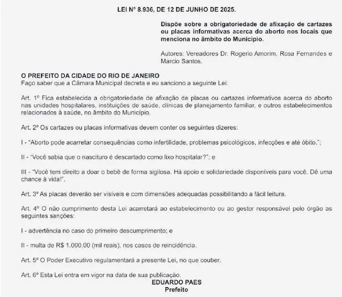 Essa lei, de autoria dos vereadores Dr. Rogerio Amorim (PL), Rosa Fernandes (PSD) e Marcio Santos (PV), foi sancionada pelo prefeito Eduardo Paes (PSD) na última semana, obrigando fixação de cartazes ou placas informativas em espaços de saúde do município do Rio de Janeiro.