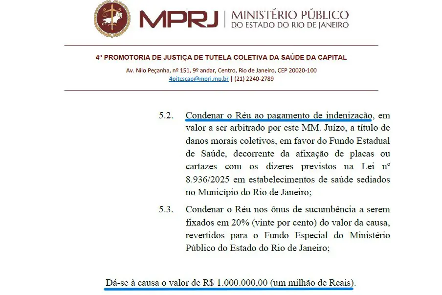 A ação pede que o Município do Rio de Janeiro deixe de fixar os cartazes e seja responsabilizado por “danos morais coletivos causados a pacientes e profissionais dos estabelecimentos de saúde”. O valor foi fixado em R$ 1 milhão (imagem abaixo).
