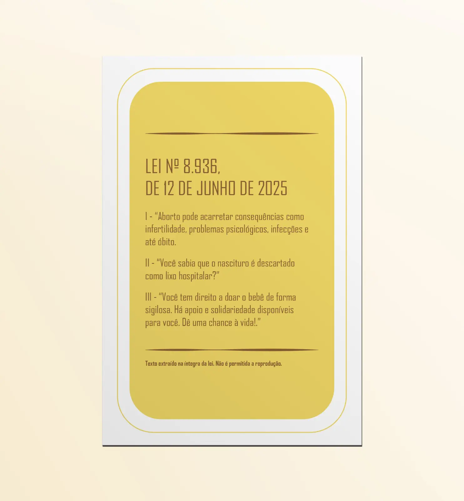 Segundo a legislação aprovada pela Câmara Municipal, os cartazes devem explicar que “o aborto pode acarretar consequências como infertilidade, problemas psicológicos, infecções e até óbito”, e também informar que “o nascituro é descartado como lixo hospitalar”. Outra opção de cartaz aprovado pelos parlamentares da cidade cita a possibilidade de doar o bebê de forma sigilosa, com apoio e solidariedade. “Dê uma chance à vida!”, afirmaria a placa.