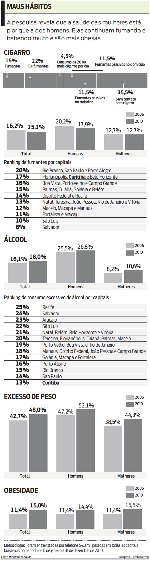 As mulheres brasileiras estão mais obesas, bebem muito e não conseguem diminuir o consumo de cigarro, segundo a pesquisa Vigitel, do Ministério da Saúde, que analisa estatísticas sobre fatores de risco para doenças crônicas. Entre 2006 e 2010, o porcentual de tabagismo feminino se manteve estável, mas o abuso de álcool subiu 30% e o índice de obesidade saltou de 11,4% para 15,5%. Os homens, ao contrário, conseguiram um desempenho melhor. O estudo revela um quadro preocupante para a saúde da mulher. Para especialistas, estresse e rotina são os principais fatores para os maus resultados. Independentemente do sexo, a tendência de queda no consumo de cigarro se manteve e os ex-fumantes são maioria, com 22%, contra 15% de quem fuma. Há 22 anos, este porcentual era de 35%. "O Brasil é um exemplo no combate ao tabagismo. Medidas regulatórias, como a proibição da propaganda de tabaco e advertências nos maços de cigarro, são muito efetivas e explicam essa importante redução no consumo do cigarro", afirma Deborah Malta, coordenadora de Vigilância de Agravos e Doenças Não Transmissíveis da Secretaria de Vigilância em Saúde do ministério.