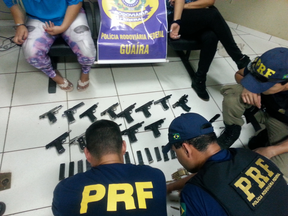Duas jovens de 21 e 23 anos que viajavam em um ônibus que fazia a linha de Naviraí (MS) a São Paulo foram presas na noite desta quarta-feira (1) pela PRF (Polícia Rodoviária Federal) em Guaíra, no Oeste do Paraná. Com elas os policiais encontraram 14 pistolas de vários calibres, inclusive de uso restrito, além de 100 munições para fuzil e 28 carregadores.