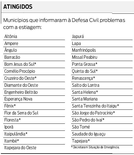 Chuvas previstas para os próximos três dias devem amenizar a seca no Paraná. São pelo menos 33 municípios sofrendo com a falta de água (veja lista abaixo). De acordo com o Instituto Tecnológico do Paraná (Simepar), as chuvas devem começar hoje, se estendem até o sábado e vão ajudar a abastecer os reservatórios de distribuição de água e as lavouras. Mas a partir de domingo o céu volta a abrir e o tempo tende a ficar seco novamente. Quase 138 mil pessoas estão sendo afetadas pela estiagem no Paraná.
