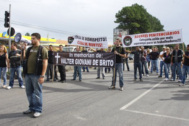 Agentes penitenciários que acompanharam o enterro do colega de trabalho Carlos Alberto Pereira, 52 anos, assassinado a tiros na tarde de terça-feira em Curitiba, fizeram uma manifestação na tarde ontem, pedindo a liberação do uso de armas de fogo pela categoria. Carregando faixas e cartazes, cerca de 50 agentes que estiveram no velório fecharam por cinco minutos a Rua João Bettega, nas imediações do cemitério Jardim da Saudade, onde o corpo foi enterrado. "Agentes Penitenciários: categoria unida por mais segurança para os trabalhadores", dizia uma das faixas.