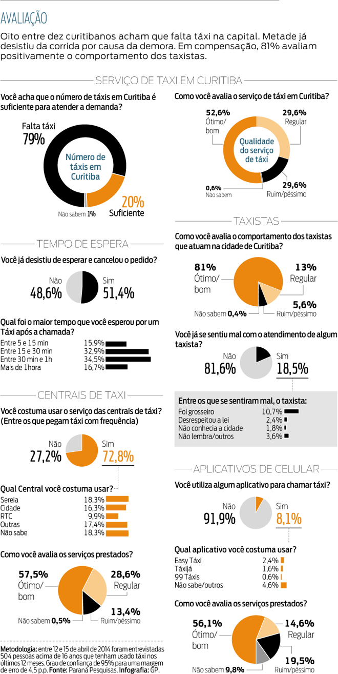 Os 750 táxis que até o fim de maio serão incorporados à frota de Curitiba vão atenuar a insatisfação com esse serviço. Oito entre dez curitibanos acham que o número atual de veículos não é suficiente para atender a demanda dos usuários na capital. Metade deles já desistiu alguma vez de esperar pelo táxi e cancelou o pedido. Os dados são parte do resultado de uma consulta realizada pela Paraná Pesquisas a pedido da Gazeta do Povo. Foram entrevistadas 504 pessoas entre 12 e 15 de abril.