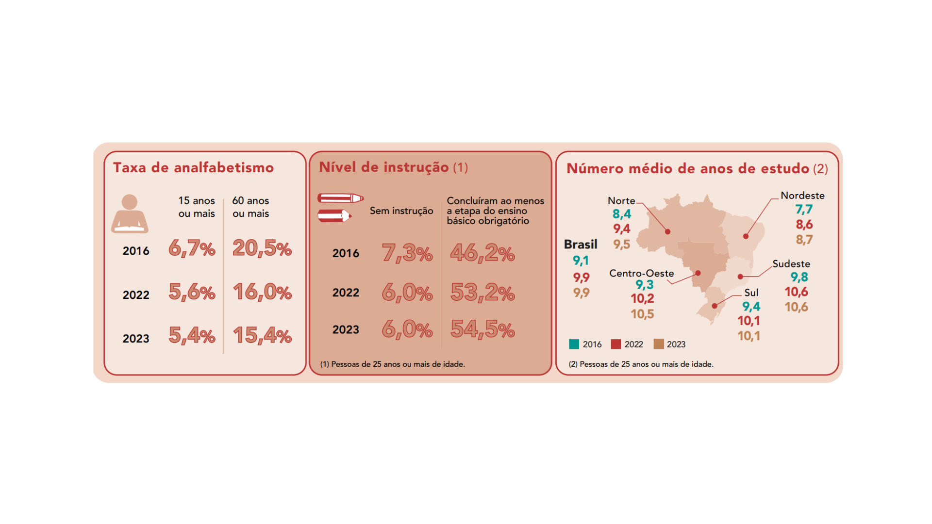 O mesmo levantamento revelou que em 2023 havia 9,3 milhões de pessoas com 15 anos ou mais de idade analfabetas e uma taxa de analfabetismo de 5,4%, o que representa um recuo de 0,2% em relação ao ano de 2022.