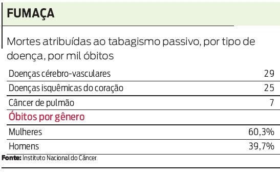 Ela defende, inclusive, que as estimativas são "conservadoras. É que a pesquisa considera como fumantes passivos apenas os habitantes de áreas urbanas com mais de 35 anos, que nunca fumaram e moram com pelo menos um fumante. Ficaram de fora do cálculo, portanto, aqueles expostos à fumaça no ambiente de trabalho e os moradores de áreas rurais.